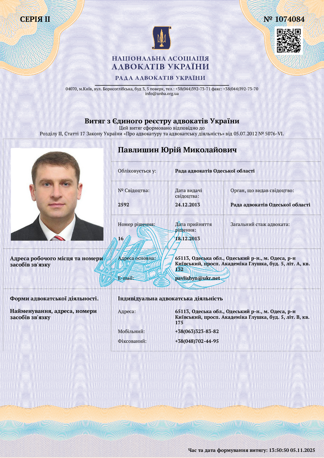 "Я, Павлишин Юрій Миколайович, урочисто присягаю у своїй адвокатській діяльності дотримуватися принципів верховенства права, законності, незалежності та конфіденційності, правил адвокатської етики, чесно і сумлінно забезпечувати право на захист та надавати правничу допомогу відповідно до Конституції України і законів України, з високою відповідальністю виконувати покладені на мене обов’язки, бути вірним присязі".