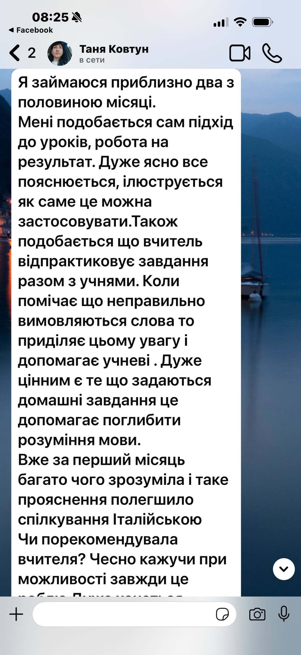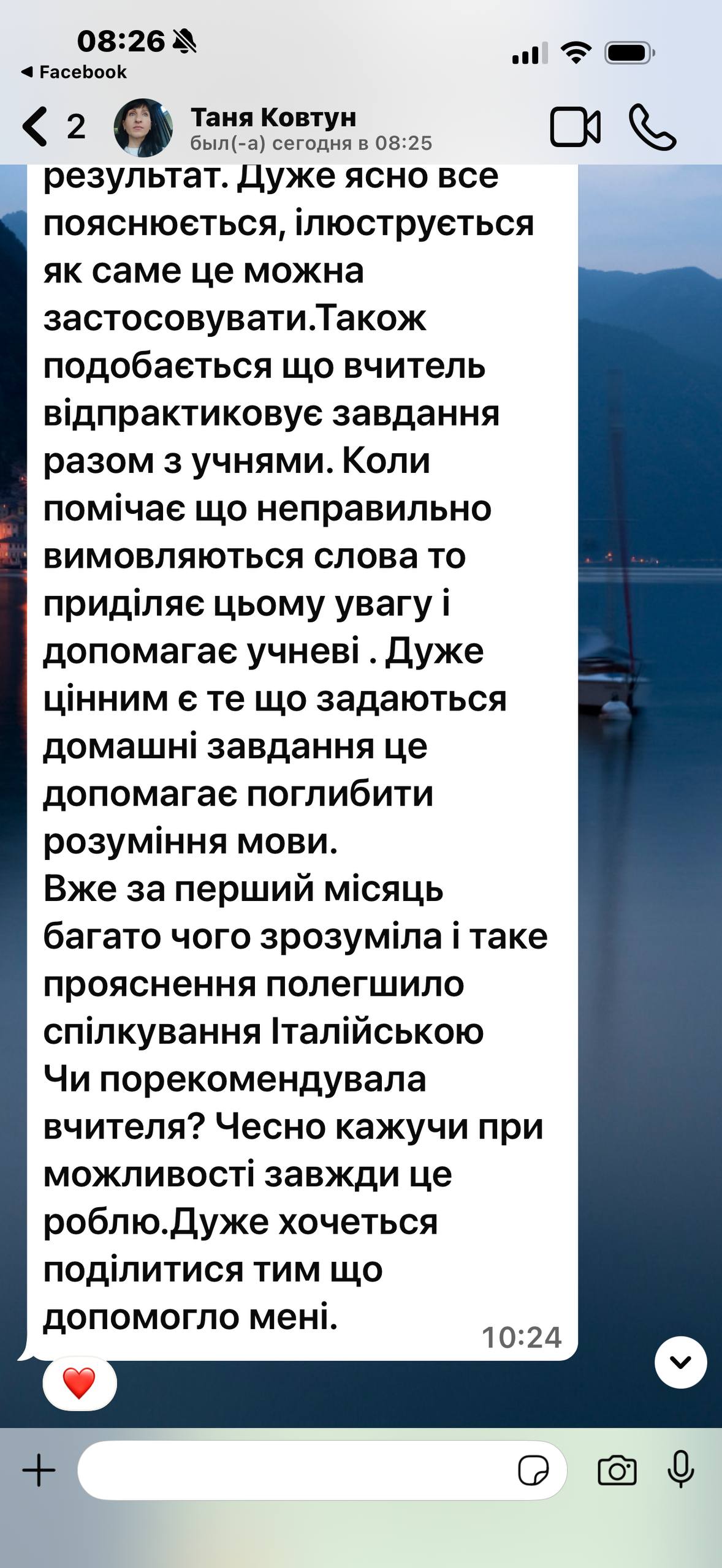 Разом зі мною працює професійний викладач Ольга — філолог з вищою італійською лінгвістичною освітою, випускниця Університету П’ємонту (Італія). Вона викладає італійську багато років, має глибокі академічні знання та чудово пояснює складні речі просто і доступно. Ми створили команду, що доповнює одна одну — щоб наші студенти отримували найкращий результат.